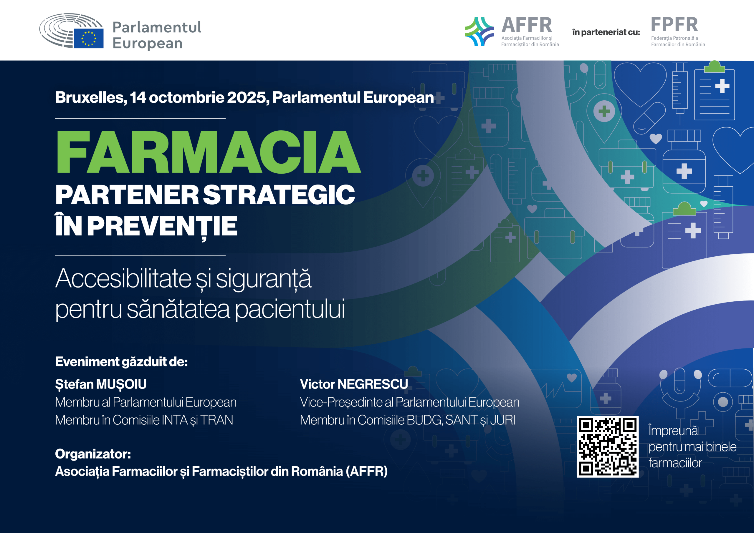 Sesiune specială la Parlamentul European AFFR organizează, cu sprijinul Parlamentului European, sesiunea specială „Farmacia, partener strategic în prevenție. Accesibilitate și siguranță pentru sănătatea pacientului”, la data de 14 octombrie 2025, la sediul Parlamentului European din Bruxelles. Evenimentul este găzduit de Ștefan Mușoiu, Membru al Parlamentului European și de Victor Negrescu, [...]